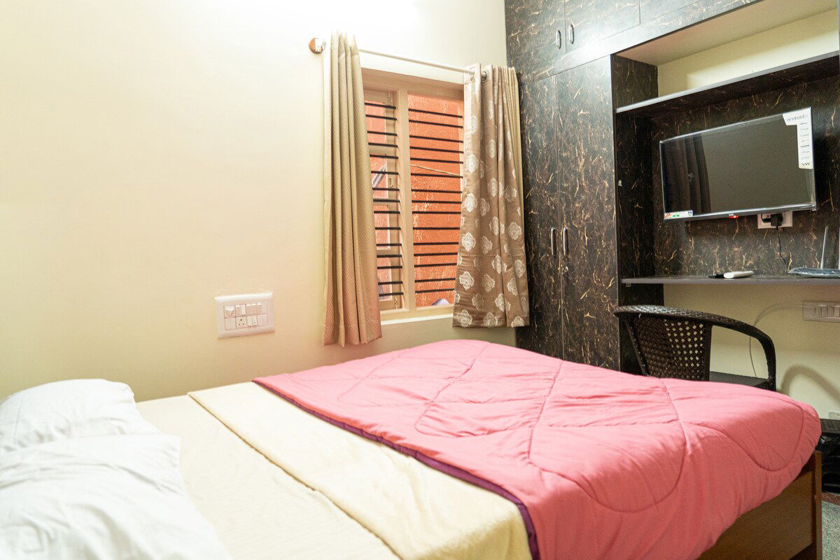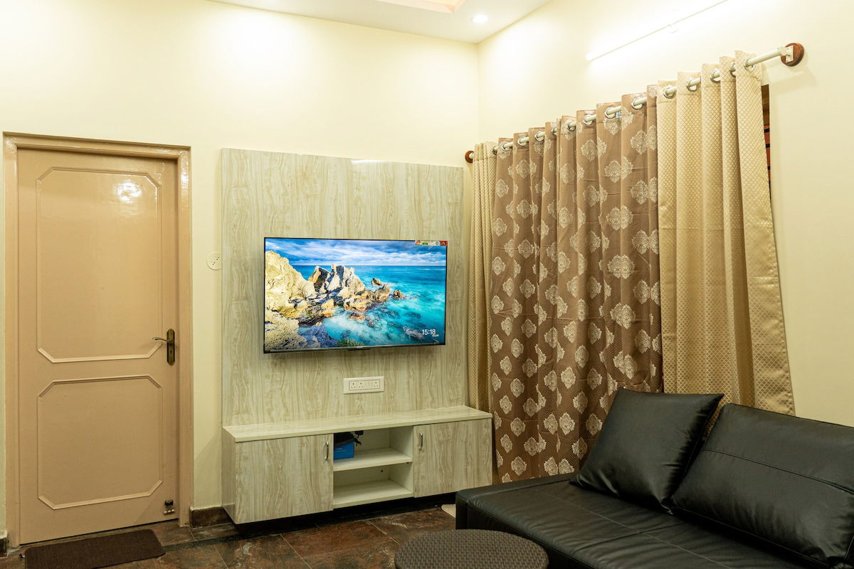 Welcome to our luxurious home stay at Bangalore, where elegance meets comfort and every detail is designed to exceed your expectations. Forget your worries in this spacious and serene space. Step into our spacious living room and fully equipped kitchen adorned with plush furnishings, tasteful décor, Sink into the sumptuous sofa which can be converted into a bed and unwind after a day of exploring the city. With a state-of-the-art 55" TV equipped with all major OTT platforms,